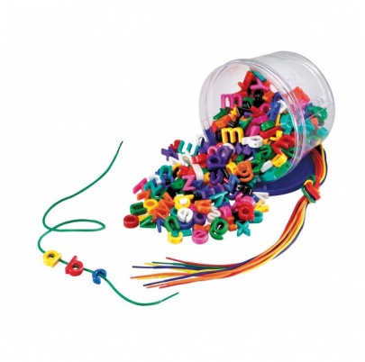 Navliekanie písmen na šnúrku podporuje u detí rozvoj jemnej motoriky.