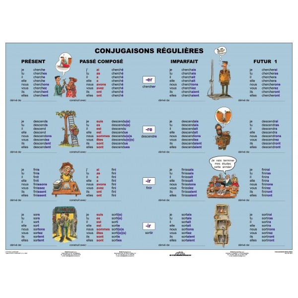Náučná tabuľa prináša prehľad časovania slovies v prítomnom čase, minulom zloženom aj jednoduchom čase a imperfekte vo francúzskom jazyku.