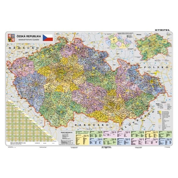 Administratívna mapy Českej republiky je aktualizované k roku 2008. Na mape vyšších územných samosprávnych celkov sú zakreslené všetky obce ČR, kompletná vodná a cestná sieť. Novinkou je vyznačenie poverených obcí a obcí s vyššou právomocou. Legenda je rozšírená o štatistické údaje o jednotlivých krajoch, a to o rozlohu, počet obyvateľov, počet poverených obcí, o vymenovanie obcí s vyššou pôsobnosťou. Súčasťou mapy je i register. Mapa je vhodná na trvalé vyvesenie.