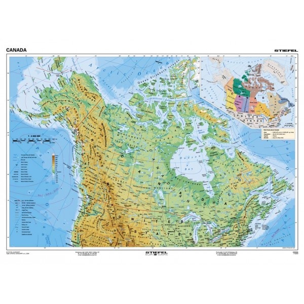 Všeobecnogeografická mapa Kanady v angličtine je vhodná na výučbu anglického jazyka a geografie na základných a stredných školách. Detailne zachytáva členitosť pobrežia severoamerického štátu, ktorý sa čiastočne rozkladá v arktickom pásme, jeho povrch a vodstvo. Súčasťou je aj zmenšená verzia politickej mapy Kanady.