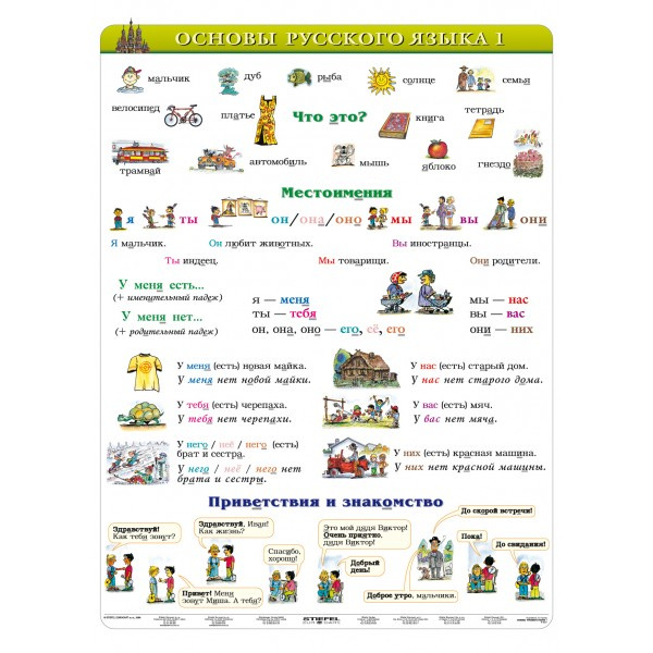Náučná tabuľa predstavuje úvod do ruského jazyka. Pomocou vtipných ilustrácií otvára základné tematické okruhy – farby, tvary, čísla, dni, mesiace a ročné obdobia. Konverzačná časť je zameraná na pozdravy, predstavenie, zoznámenie a lúčenie.