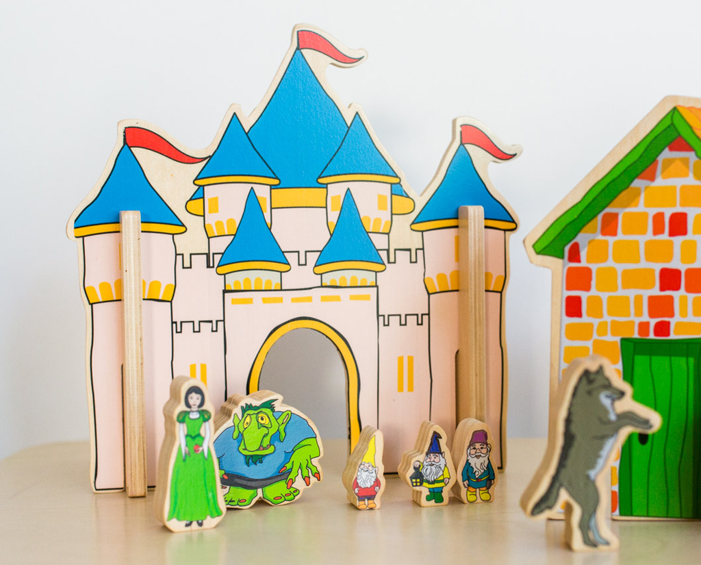 Kreatívna drevená súprava obsahuje postavičky a dekorácie k rozprávkam: