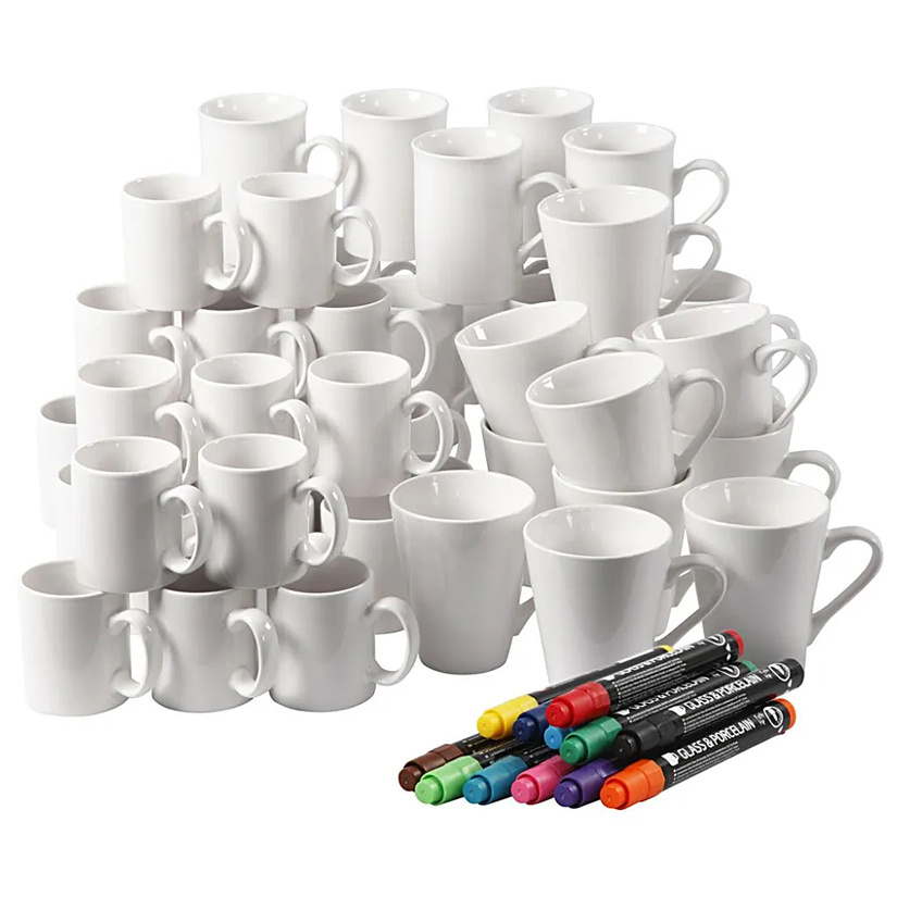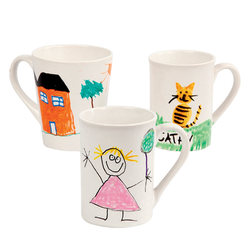 Sada obsahuje materiál potrebný na dekorovanie bielych porcelánových hrnčekov rôznych tvarov a veľkostí. Ozdobené hrnčeky nechajte schnúť 1 deň a následne vypaľujte 40 minút v rúre pri teplote 160 °C.