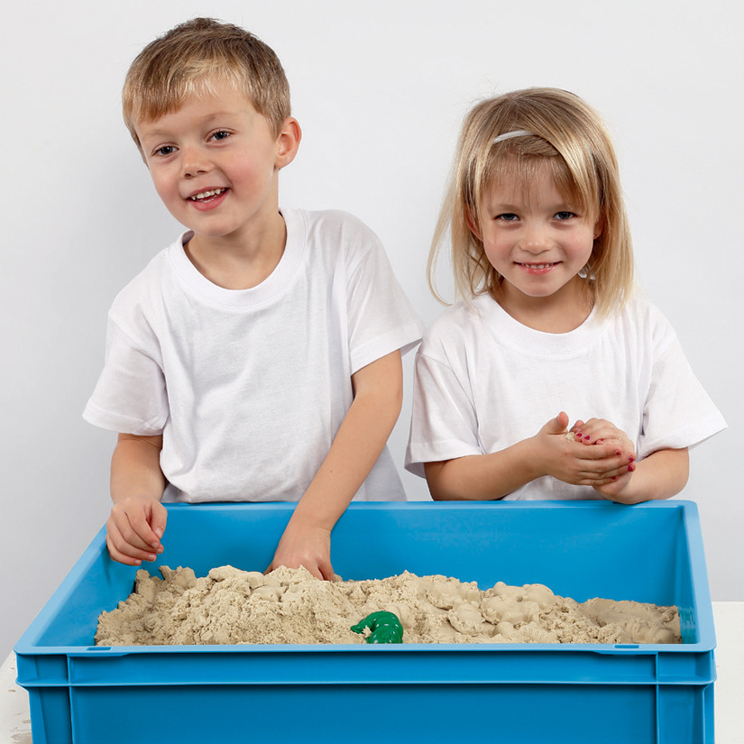 Jemný, netoxický modelovací piesok v praktickom boxe s vekom, ktorý sa môže použiť aj ako pieskovisko.