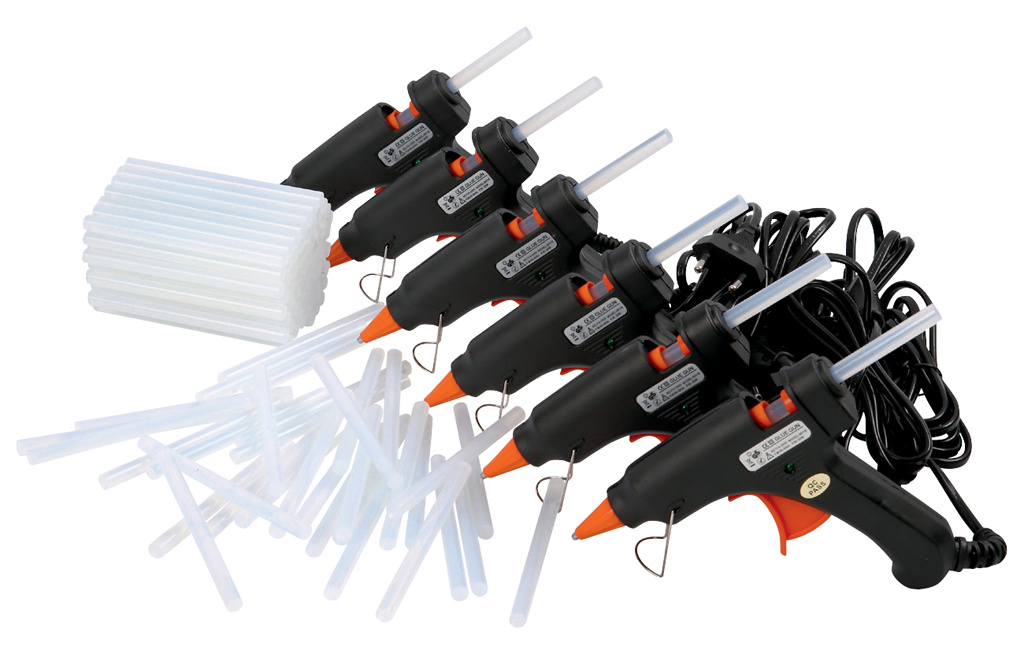 Súprava mini tavných pištolí a lepiacich tyčiniek, ktoré sa topia pri teplote 110 °C.