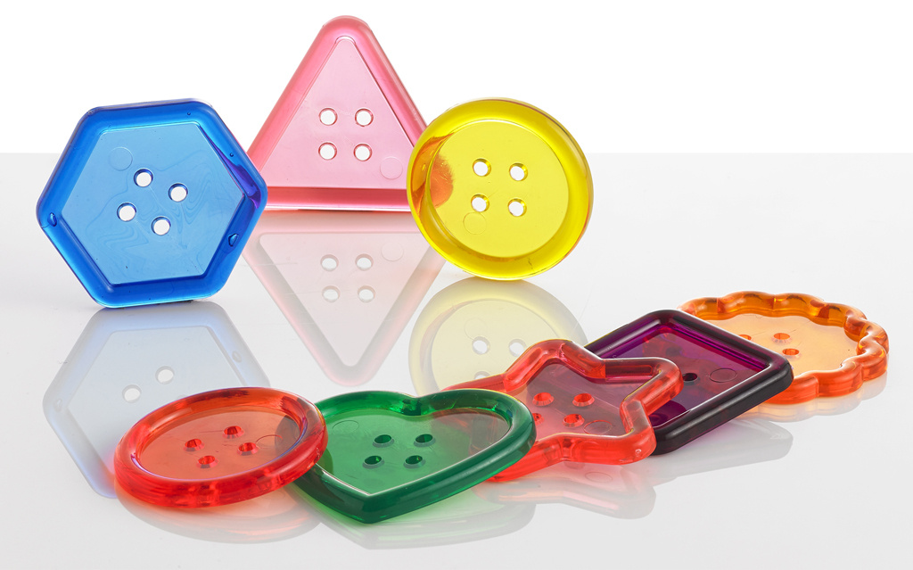 Veľké priehľadné gombíky sú určené na rozpoznávanie farieb a tvarov, získavanie prvých matematických zručností (triedenie, počítanie, vytváranie logických radov) a rozvoj jemnej motoriky.