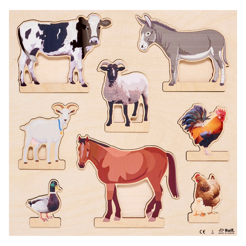 - 8 drevených domácich zvierat (krava, kôň, somár, koza, ovca, sliepka, kohút, kačka)