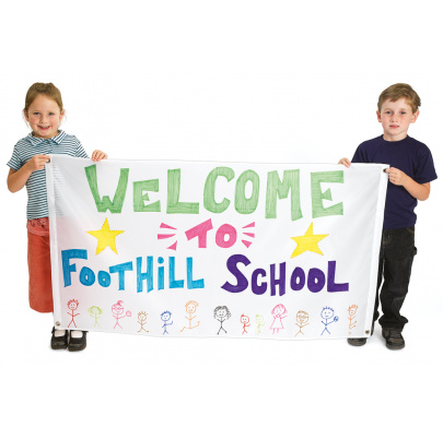 Banner môžu deti vyzdobiť farbou na látku, fixkami, ale aj modelovacou hmotou, brmbolcami, trblietkami či očami. V každom rohu je kovový otvor na zavesenie.