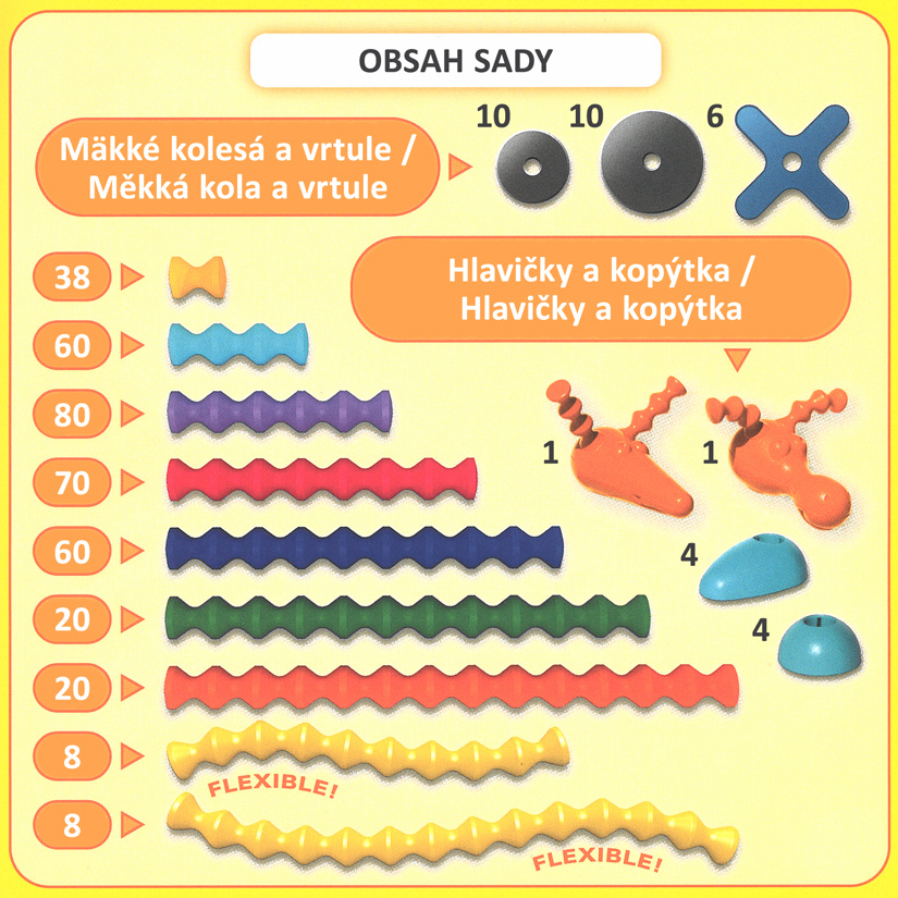 Kreatívna stavebnica obsahuje dieliky s rozličnou dĺžkou, ktoré do seba dokonale zapadajú a umožňujú deťom pri skladaní objektov naplno popustiť uzdu fantázii.