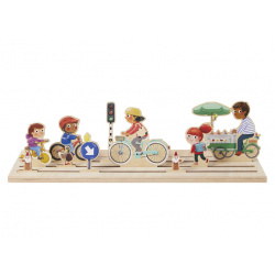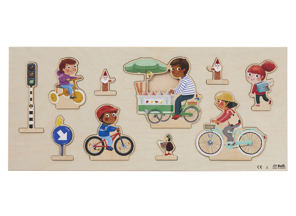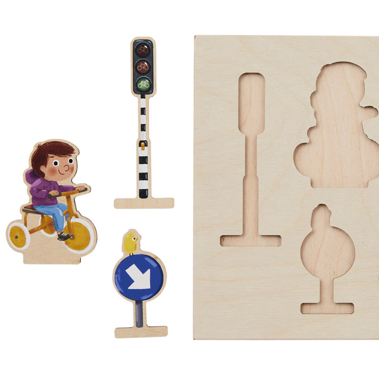 Drevené hracie puzzle s pôvabnými kresbičkami podporuje nielen rozvoj jemnej motoriky a priestorového vnímania, ale aj detskej predstavivosti, slovnej zásoby a rečových zručností. Stačí povyberať dieliky puzzle z drevenej dosky a otočiť ju na hraciu plochu. Deti zasúvajú dieliky puzzle do drážok a vymýšľajú si rôzne príbehy.
